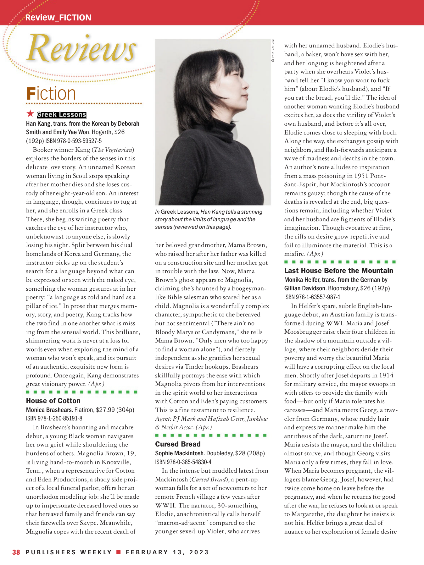 Booker winner Kang (The Vegetarian) explores the borders of the senses in this delicate love story. An unnamed Korean woman livi...